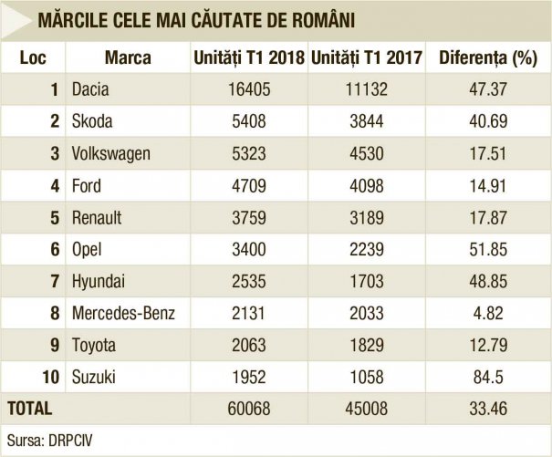 Din totalul de peste 234.000 de autoturisme de ocazie înmatriculate în acest an nu mai puţin de 59.265 de unităţi aparţin mărcii Volkswagen, aceasta fiind evident cea mai căutată marcă pe piaţa second-hand. Locul secund în clasamentul maşinilor de ocazie este ocupat de Opel, cu 25.309 unităţi, iar pe a treia poziţie se află BMW cu 22.239 unităţi. Urmează Audi (21.941 unităţi) şi Ford (21.743 unităţi).
